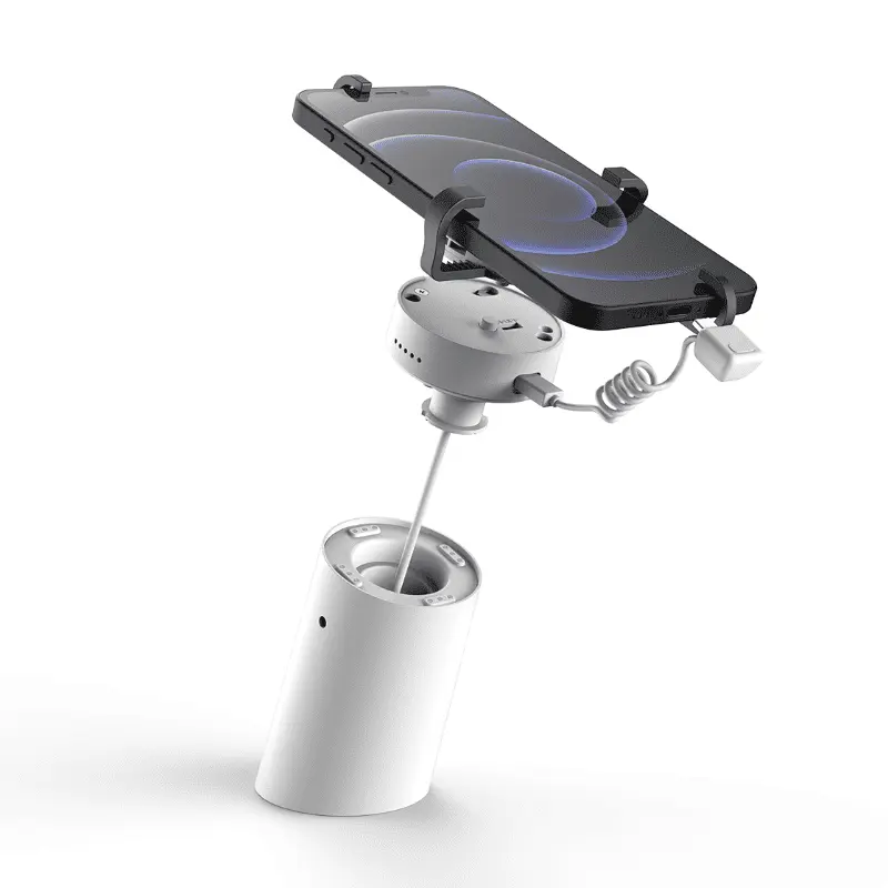 The MBS1008 mobile phone security display stand is built for retailers who need high security without losing the hands-on demo. A 4-metal grip locks the device firmly in place, while an internal recoiler lets shoppers lift, rotate, and test the phone naturally. When released, the tether pulls back smoothly and the device returns to its exact position—tidy, repeatable, and ready for the next customer. This mobile security stand uses an angled cylindrical post so screens face visitors perfectly whether you mount it on a desktop, a wall panel, or an inclined display. Inside, anti-cut retractable steel cable and an electronic alarm create layered protection against tampering and grab-and-run attempts; a top lock can be engaged for higher-risk zones. The clean, cable-free exterior fits modern store design, and dual mounting options (industrial 3M adhesive or through-table screws with wing nuts) support fast rollouts and rock-solid stability. Reliable charging keeps demos alive all day, reducing staff resets and keeping tables neat. For multi-brand retailers, electronics malls, and flagship environments, MBS1008 delivers the balance every category manager needs: a premium look, interactive trials, and serious theft deterrence from a single mobile phone security display stand.